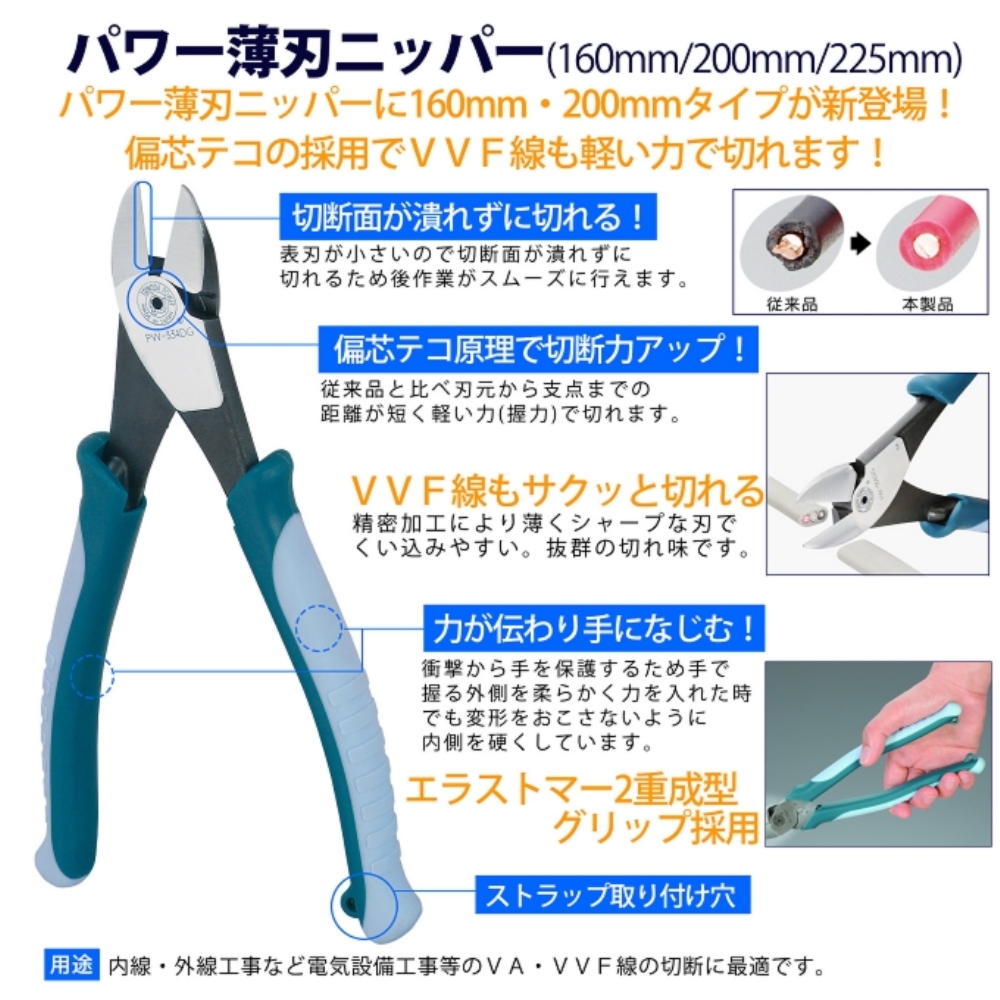 ・薄刃タイプで刃が喰い込みVVF3心線もサクッと切れます。