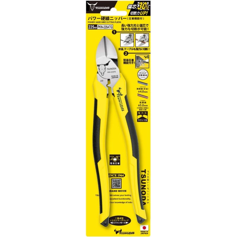 ツノダ パワー硬線ニッパー 圧着機能付 225mm エラストマーグリップ DIY 工具 ツール PKN-225ATG メール便送料無料