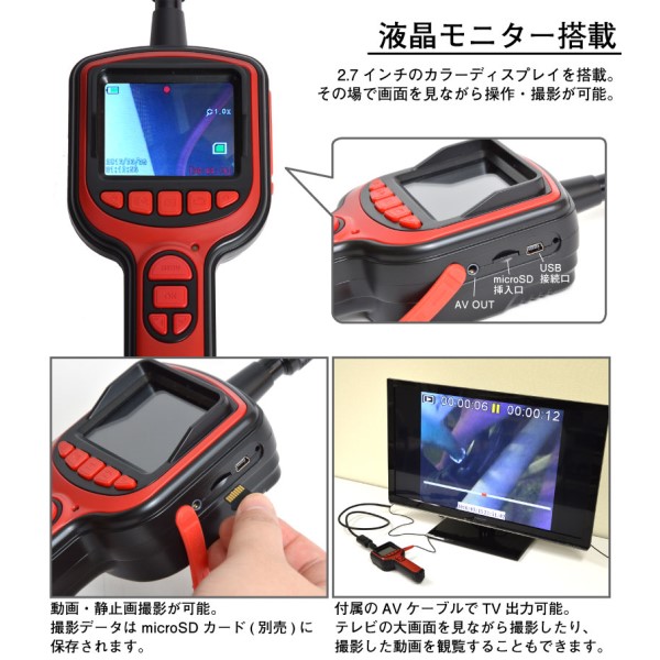 ・「9mmデュアルカメラ切り替え工業用内視鏡」は2つのカメラを搭載しており、カメラの切り替えによって、正面・側面のどちらも確認することが可能です。