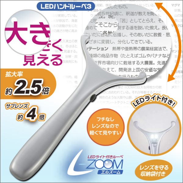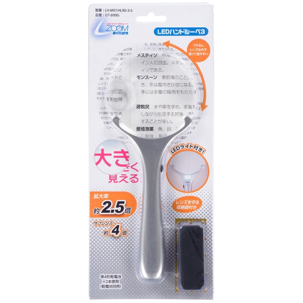 【メール便送料無料】OHM LEDハンドルーペ シルバー 倍率2.5倍 拡大鏡 L-ZOOM 07-8995 LH-M01HL90-3-S