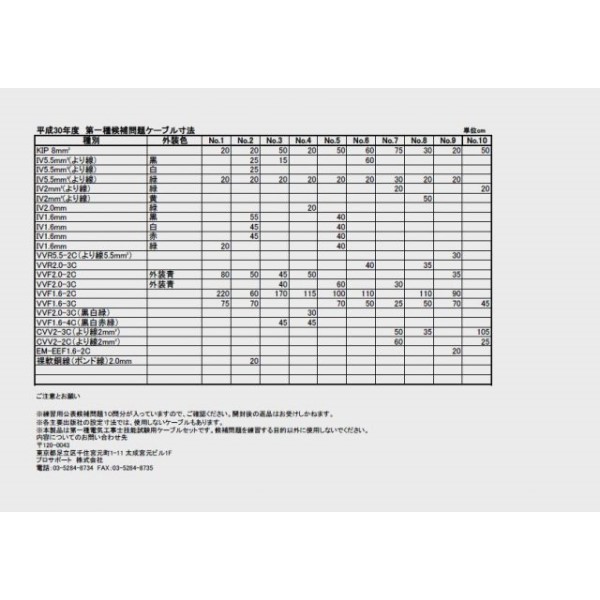 ・著者:藤瀧和弘「かずわん先生」の「ぜんぶ絵で見て覚える第1種電気工事士技能試験すぃ〜っと合格」に掲載されている全10問のケーブルが含まれています。