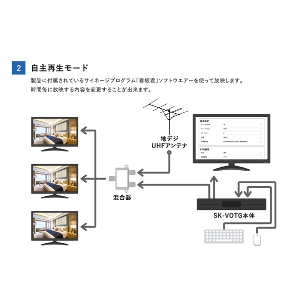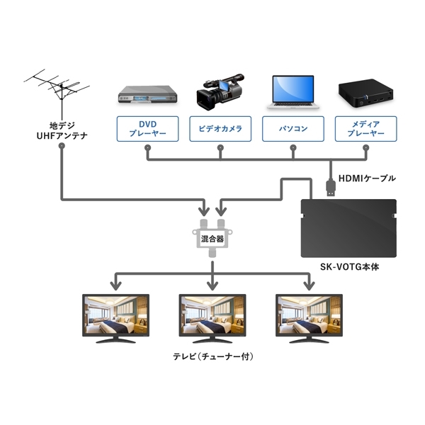 ・テレビアンテナ線の大元にアンテナ混合器を使って、テレビ信号と当製品の信号を混合し、放送がない空きチャンネルに自主放送が可能となります。