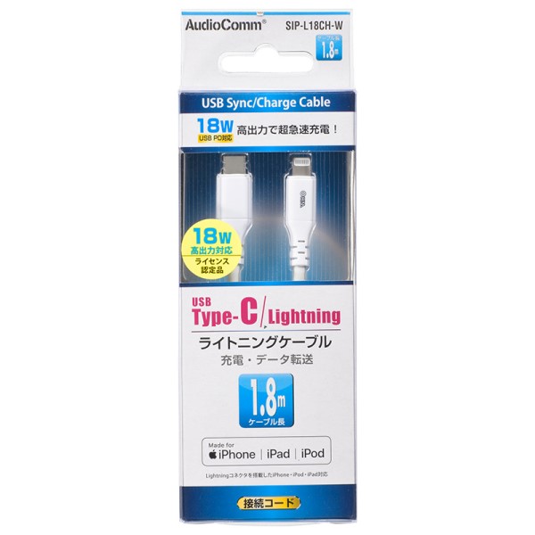 【メール便送料無料】ライトニングケーブル/Type-Cケーブル 1.8m ホワイト 充電・データ転送対応 OHM 01-7123 SIP-L18CH-W 携帯電話 スマートフォン iPhoneアクセサリ