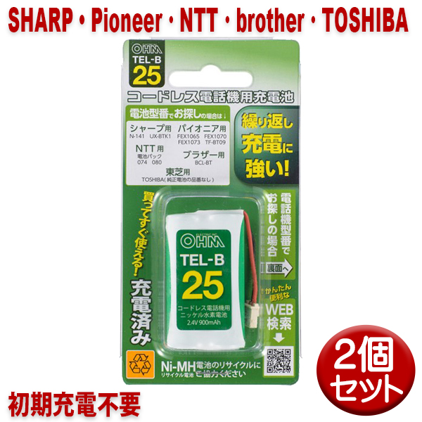 【メール便送料無料】シャープ・パイオニア・NTT・ブラザー・東芝用コードレス電話機 子機用充電池 2個セット N-141・TF-BT09同等品 05-0025 OHM TEL-B25 すぐに使える充電済み 互換電池