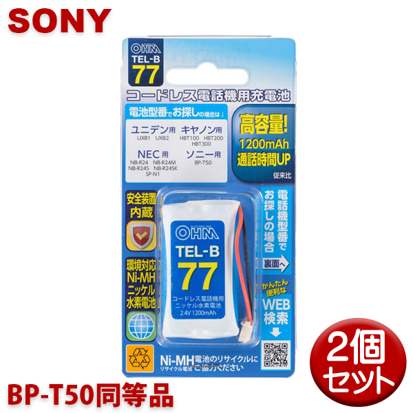 【メール便送料無料】ソニー用コードレス電話機 子機用充電池 2個セット BP-T50同等品 容量1200mAh 05-0077 OHM TEL-B77 コードレスホン 互換電池