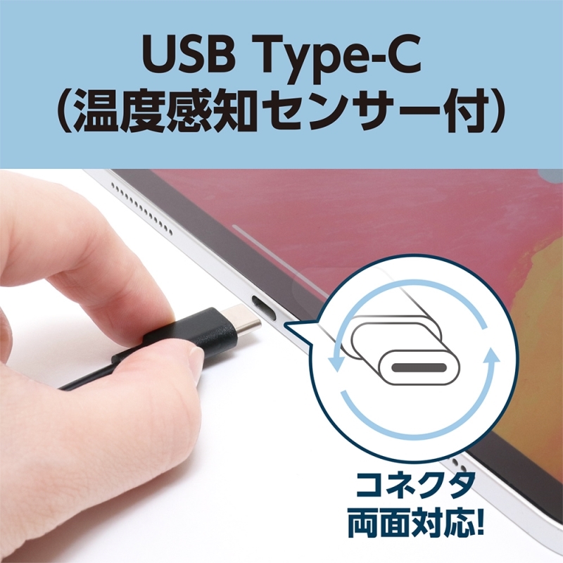 ■Type-C端子に発熱感知センサーを搭載しており、規定値を超えた温度を感知すると自動で充電が止まります。一度充電が止まって温度が規定値以下に戻ると充電が再開されます。