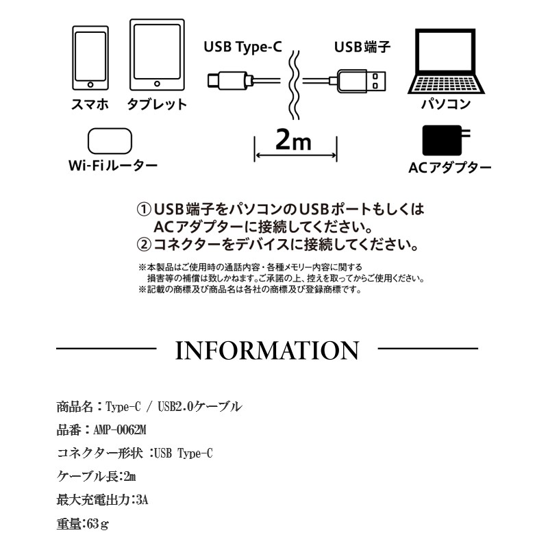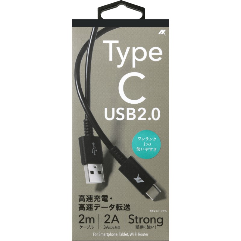 USB Type-Cケーブル 2m 2A ブラック 充電 データ転送対応 高耐久TypeCケーブル アクセス AMP-0062MBK メール便送料無料
