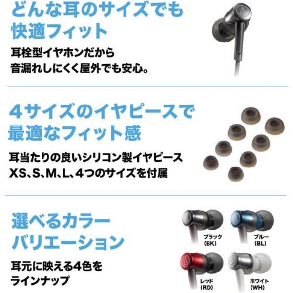 ■耳当たりの良いシリコン製イヤピースXS、S、M、L、4つのサイズを付属。自分にぴったりのフィット感を調整できます。