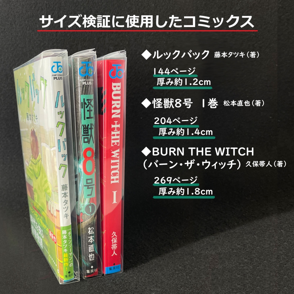 ・厚み約1.8cmまで対応、約250ページ前後(ページ数を確認したい場合はGoogle等で「コミックタイトル名 〇巻 ページ数」検索で確認いただけます。)