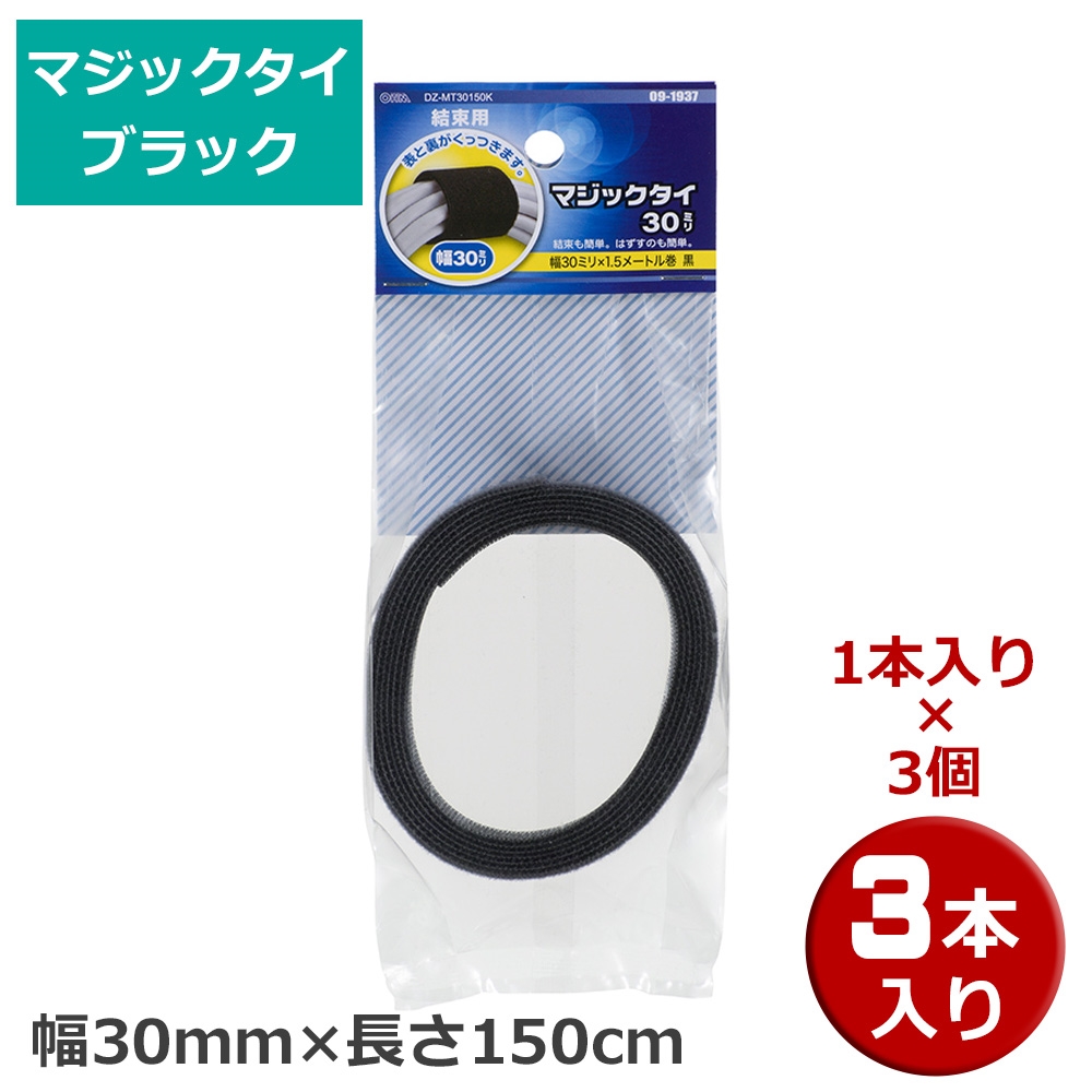 【メール便送料無料】マジックタイ 3本(1本×3個) 幅30mm×長さ150cm ブラック OHM 09-1937 DZ-MT30150K-3P 結束バンド マジックテープ ケーブルまとめ
