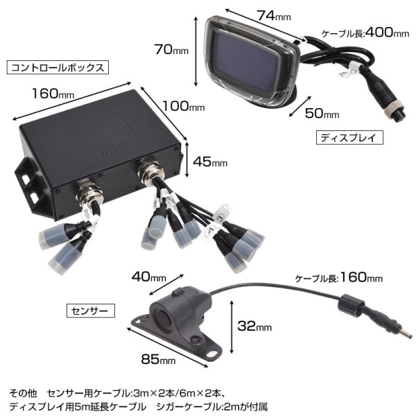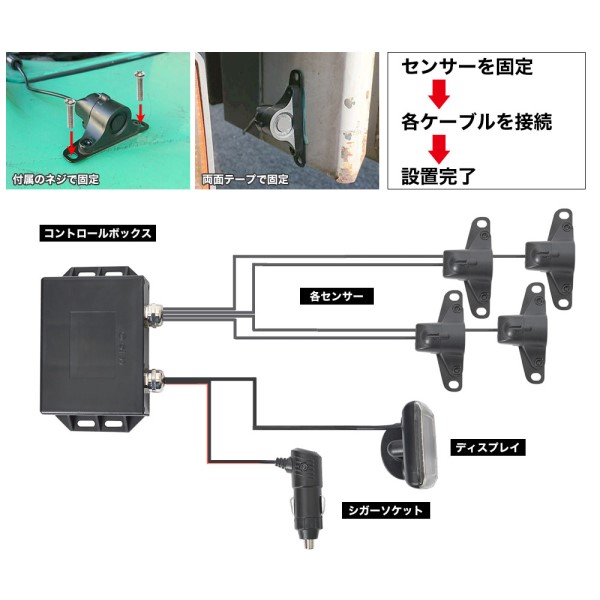 ■付属品:コントロールボックス、ディスプレイ、シガーケーブル(2m)、5mディスプレイケーブル、センサー4個(3m×2本、6m×2本ケーブル接続済)、ネジ(12セット)、日本語説明書