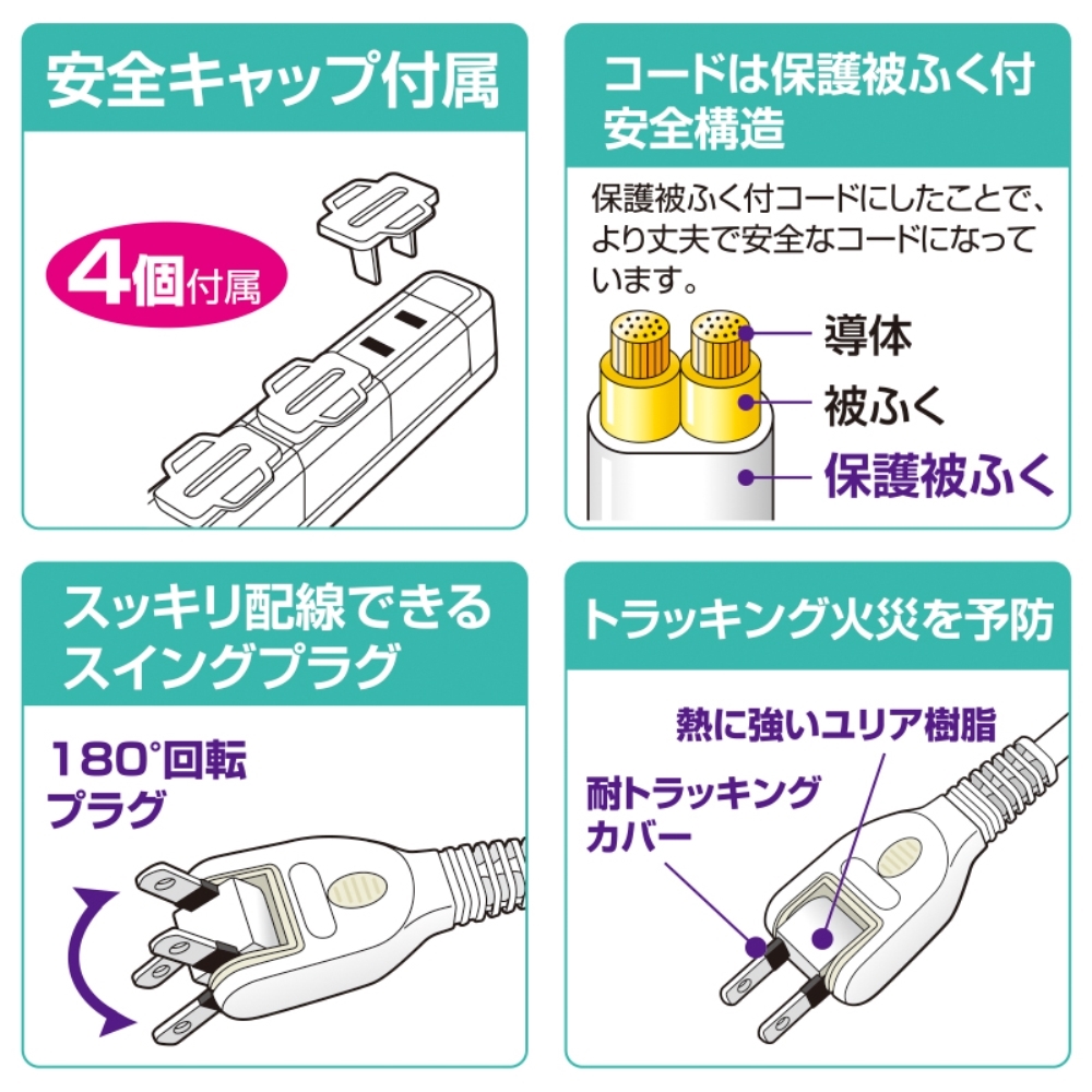 ・安全キャップ付属、コードは保護被覆付安全構造です。