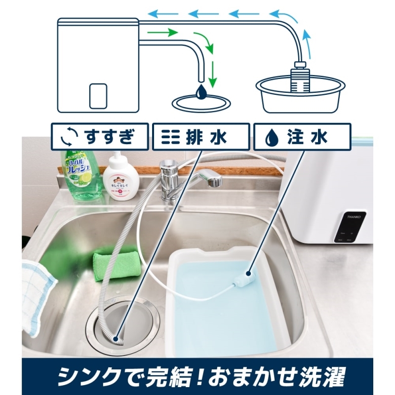 ・注水ホースと排水ホース付きだから、キッチンでふきんのお洗濯が完結します。