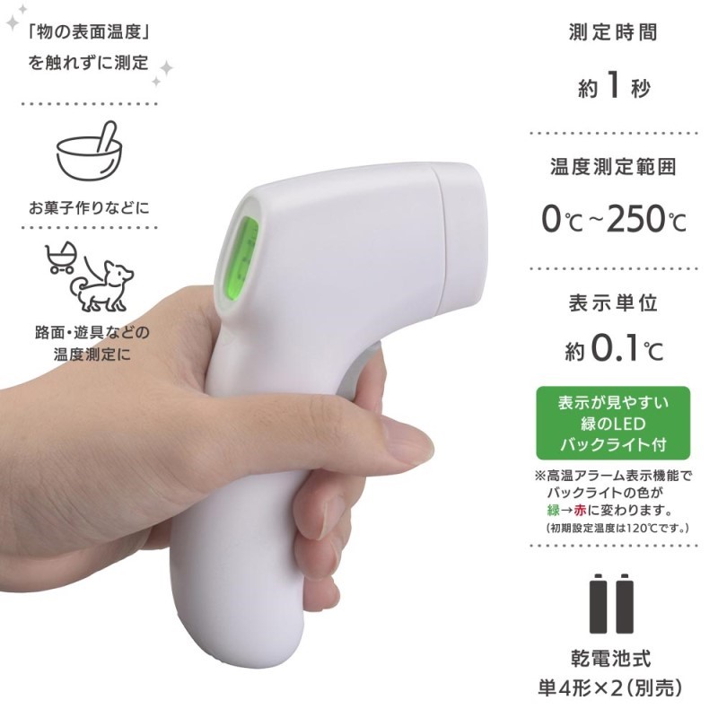 ■揚げ物の調理やお菓子作り、離乳食に、また路面・遊具などの温度測定に、0℃〜250℃までの物の表面温度を測定できます。