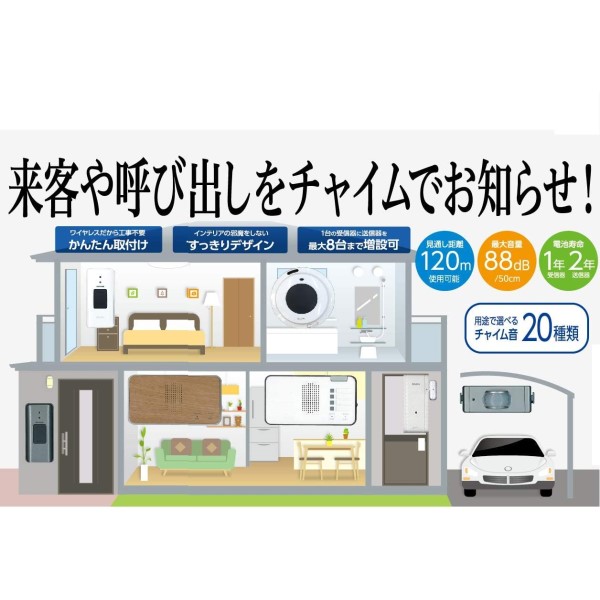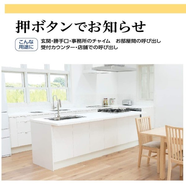 ・電波の到達距離は見通し約120m。一般家庭や店舗、事務所における呼び出しや報知用に最適です。