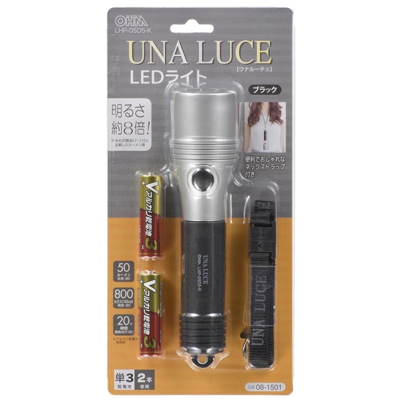 【送料無料】LEDライト ウナルーチェ 50lm 電池付き ブラック OHM 08-1501 LHP-05D5-K