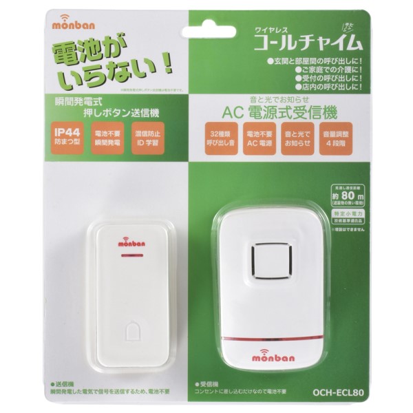 【送料無料】ワイヤレス コールチャイムセット 押しボタン送信機(瞬間発電式)+受信機(AC式) monban OHM 08-0520 OCH-ECL80 介護・玄関・受付・店内の呼び出しに