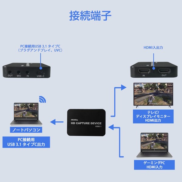 ■接続端子:PC接続用USB3.1タイプC(プラグアンドプレイ、UVC)、HDMI入力×1、HDMI出力×1、Line in×1(3.5mm)、Line out×1(3.5mm)、マイク入力×1(3.5mm)