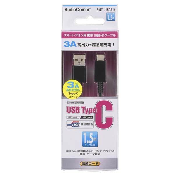 【メール便送料無料】Type-C USB2.0ケーブル 1.5m ブラック A-Ctype OHM 01-7065 SMT-L15CA-K